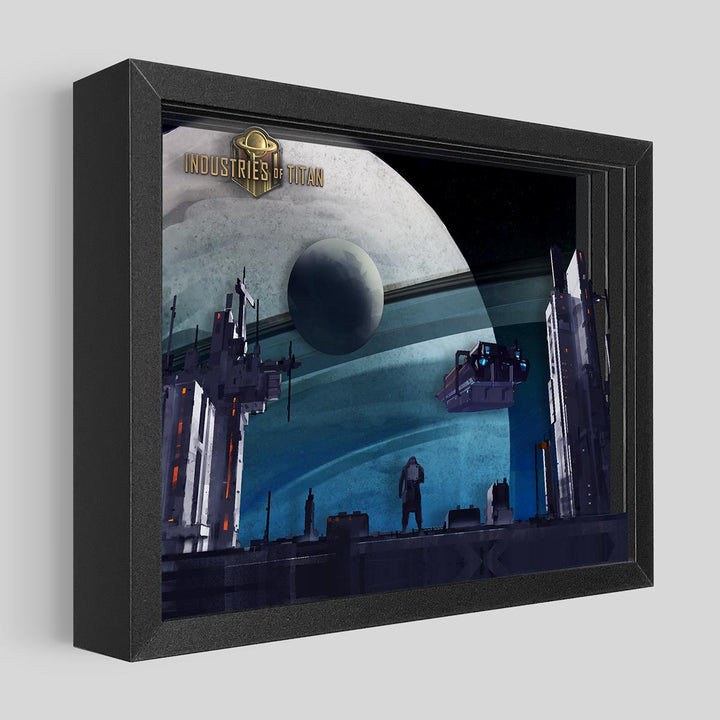This collectible shadowbox art piece measures 12" x 15 1/2" x 2 1/2" and comes ready to hang with an official Industries of Titan Certificate of Authenticity (COA).